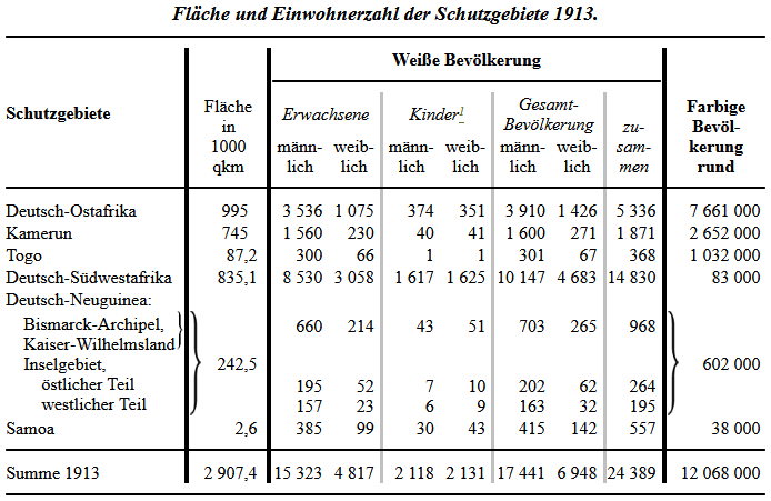 So kann man eine deutsche Kolonialwirtschaft kaum bis über die Jahrhundertwende zurückdatieren, und man muß sich, will man das in den folgenden anderthalb Jahrzehnten Geleistete gerecht beurteilen, der Worte erinnern, die Benjamin Raule 1683, nachdem er am Neujahrstage an der westafrikanischen Goldküste auf dem von ihm begründeten Fort Groß-Friedrichsburg die kurbrandenburgische Flagge gehißt hatte, dem Kurfürsten Friedrich Wilhelm schrieb: "Es ist kein Mensch so unverständig, daß er nicht wissen sollte, daß man im ersten Jahre von einem neulich gepflanzten Baum keine Früchte brechen kann." Um so bemerkenswerter ist, was in der kurzen Zeitspanne zwischen dem Jahrhundertbeginn und dem Kriege kolonialwirtschaftlich erreicht worden ist. Im einzelnen wird darauf in den folgenden Abschnitten einzugehen sein. Die Hauptlinien der Entwicklung seien hier durch einige wenige Zahlenübersichten bezeichnet. Die weiße Bevölkerung der Kolonien entwickelte sich – nach dem Stand am 1. Januar jeden Jahres – folgendermaßen: