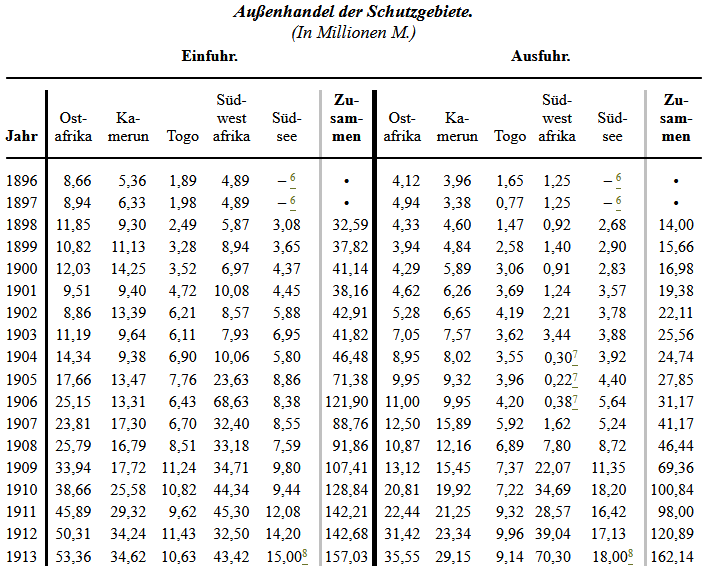 Nach der Handelsstatistik des Deutschen Reiches war das Mutterland am Außenhandel seiner Schutzgebiete mit folgenden Summen beteiligt: