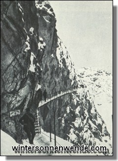 Die weite Sicht des Hochgebirges zwang zum besonderen Ausbau der Zugangswege zu den Stellungen, die oft auf weite Strecken beherrschend vom Feinde eingesehen waren. Es wurden Tunnelbauten angelegt, die ganze Felsmassive durchstießen. Vor dem 2477 m hohen Sasso di Stria, nahe dem Pordoijoch in den Dolomiten, dessen senkrecht nach [138] Süden abfallender Gipfel von den Österreichern besetzt war, wurde eine etwa 200 Meter tiefere Terrasse besetzt gehalten, die feindwärts senkrecht unter der Hauptstellung des Gipfels lag. Mit einem 500 Meter langen Felsstollen wurde der ganze Felskörper des Sasso di Stria durchfahren und so war es möglich, daß die Besatzung sicher und rasch in ihre wie ein Söller gegen den Feind in die Luft hinausragende Stellung gelangte. Die Bohrarbeiten selbst, das Aussprengen von Kavernen und der Bau von Tunnels war außerordentlich mühsam. Nur an wenigen, besonders wichtigen Teilen der Front konnten den Truppen für den rascheren Fortschritt der Arbeiten im Fels Bohrmaschinen zur Verfügung gestellt werden. Meist aber wurden die Arbeiten nur mit Bohrstange und Schlägel bewältigt. Unverdrossen arbeiteten auch die Kampftruppen trotz ihres schweren Dienstes im Schützengraben am Kavernenbau, um sich dadurch sicherere und besser bewohnbare Unterkunftsmöglichkeiten zu schaffen. Die Arbeiten im Fels konnten auch dadurch große Gefährlichkeit erlangen, daß durch zu vieles Anbohren des Felskörpers ganze Teile des Berges zusammenbrachen oder abstürzten. Durch einen solchen Abbruch erlitten die italienischen Truppen außerordentlich schwere Verluste. In den Lorafelsen südlich des Pasubio hatten sie in eine 25 Meter hohe Felswand ein kleines Dörfchen eingebohrt. Durch diese zahlreichen Anbohrungen brach die ganze Felswand in sich zusammen und stürzte in der Nacht, alles mit sich reißend, in die Tiefe. Mehr als 200 Soldaten und Offiziere fanden hiebei den Tod. Es gibt kaum einen Felsberg an der Alpenfront, der nicht durch zahlreiche Kavernen angebohrt wurde. Aus ihren Felswänden starren heute noch wie die toten Augen des Krieges schwarze Löcher, aus denen durch Jahre Feuer und Verderben spie. Große Arbeiten waren an jenen Felsbergen nötig, deren steile Felswände nur durch schwere Kletterarbeit zu bezwingen waren, die jedoch ständig von größeren Truppenabteilungen auf ihrem Weg in die Stellungen begangen werden mußten. Auf der Costabella in der südlichen Marmolatagruppe wurde durch die vollkommen glatten, auch für Kletterer kaum bezwingbaren Wände ein Hängesteg (Abb. 41) angelegt, der es den Soldaten ermöglichte, gegen feindliche Sicht gedeckt rasch und sicher in die Stellungen zu gelangen. Auf dem benachbarten Col Ombert, 2671 m (Abb. 51), wurde eine österreichische Feldwache errichtet. Da der Berg auf der österreichischen Seite mit einem sehr steilen Felsgrat abstürzte, war es notwendig, den Zugang zu dieser Feldwache so zu erzwingen, daß man vom Fuß des Berges bis auf den Gipfel eiserne Leitern in den Felsen verankerte, auf denen die Besatzung ihren steilen Weg zum Gipfel nahm. Eine der größten, versicherten Weganlagen schufen die Italiener, auf der sie vom Zebrùgletscher aus den Gipfel der Thurwieserspitze, 3648 m, erreichten (Abb. 33). Die Versicherung wurde durch hängende Seile bewirkt, die an manchen Stellen doppelt und dreifach gelegt waren, eine Länge von 3000 m hatten und eine Höhe von über 700 m, von 2900 auf 3648 m, bewältigten. Sehr zu Recht wurde diese Steiganlage, in die auch vielfach Strickleitern eingebaut waren, die "Himmelsleiter" genannt.