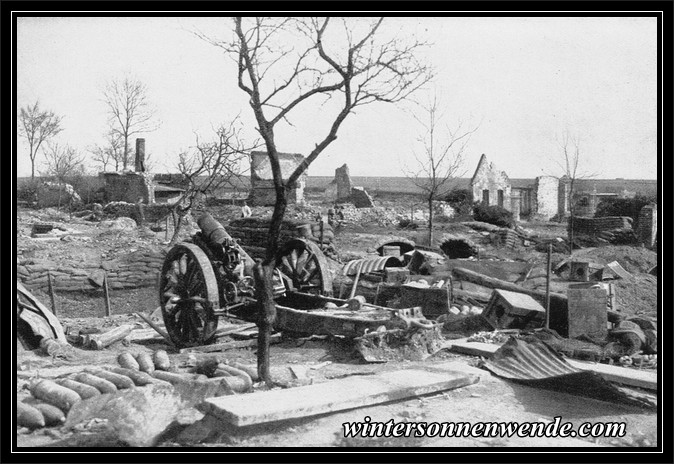 Eroberte englische Stellung in Roisel mit erbeuteter 10-cm-Haubitze. |