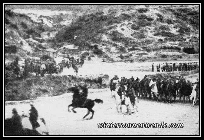 Der Befehl zur Attacke. Türkische Kavallerie reitet gegen eine starke englische Patrouille an, die über die Stranddünen vorgedrungen ist. Gesammelte Infanterie-Reste, die unmittelbar hinter der Stellung in Ruhe lagen, erhalten eben den Befehl, eiligst die Reservestellungen zu beziehen, um einen Durchbruch zu verhindern. Gallipoli, April 1915. |