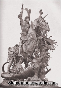[Nach wikipedia.org.] Immer ist in dieser Zeit ausdrücklich von Malerei die Rede, nicht von Bildhauer-Arbeit. "Mester Bernde, dem maler," zahlt die Nowgorodfahrerkompagnie eine hohe Summe für die dekorative Ausstattung ihrer Kapelle, während ausdrücklich erwähnt wird, daß das Schnitzwerk von "Mester Ilies" stammt, nicht von ihm. Malerei ist es wiederum, eine "tafele, de mester Bernd Notken malet", die 1471 der aus Frankfurt a. M. gebürtige Lübecker Kaufmann Johann Biis in seinem Testament erwähnt, ein Werk, das uns leider nicht erhalten ist. Das gibt die Richtung an, in der wir des Künstlers eigenhändigen Anteil zu suchen haben, am ersten der erhaltenen und urkundlich belegten Riesenwerke, die bei Notke bestellt worden sind. 1478 finden wir den Künstler tätig für den Hochaltar des Doms von Aarhus im Auftrag des dänischen Bischofs Jens Iwersen. Voraussichtlich ist die sehr umfangreiche Arbeit aber schon früher begonnen, denn eine Inschrift nennt als Vollendungsdatum das Jahr 1479.