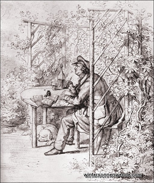 Die alte Frau Dorothea Rollwenzel in dem Gasthaus am Fuß der Eremitage, zu dem er zwanzig Jahre lang fast täglich von Bayreuth aus hinlief, mit dem Knotenstock in der Hand, mit Manuskripten und Büchern im Ranzen, ein paar Flaschen Wein in den Rocktaschen und seinem Pudel Ponto an der Seite, um dort, von ihr verpflegt, den Tag zu arbeiten, sagte kurz nach seinem Begräbnis von ihm: "Gott hab' ihn selig! Er war's hier schon. Eine Blume konnte ihn selig machen über und über, oder ein Vögelchen, und immer, wenn er kam, standen Blumen auf seinem Tisch, und alle Tage steckte ich ihm einen Strauß ins Knopfloch. Es ist nun wohl ein Jahr, da blieb er weg und kam nicht wieder. Ich besuchte ihn drinnen in der Stadt, noch ein paar Wochen vor seinem Tode; da mußte ich mich ans Bett zu ihm setzen, und er frug mich, wie es mir ginge: 'Schlecht, Herr Legationsrat', antwortete ich, 'bis Sie mich wieder beehren.' Aber ich wußt' es wohl, daß er nicht wiederkommen würde, und als ich erfuhr, daß seine Kanarienvögel gestorben wären, da dacht' ich: er wird auch bald nachsterben. Sein Pudel überlebt ihn auch nicht lange, ich hab' ihn neulich gesehen, das Tier ist nicht mehr zu kennen."