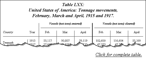 Generous financial support, and an understanding on our part that Mexico is to recover the lost territory in Texas, New Mexico and Arizona. This excited great anger, and the congressmen were quick to see how much it discredited them before their constituences; for an influential group of senators at once challenged the authenticity of the message. Thirdly, the paralysis of shipping was almost unrelieved, and was still felt far inland, on the railways, and in the country towns. If any had hoped, that the arming of merchantmen, and a revival of the practices of armed neutrality, would restart the flow of trade, they were soon undeceived. Armed neutrality had seemed attractive to several senators and congressmen, as being a subject which invited another display of their scholarship; to the ordinary people it was a terrible failure, as may be seen from the following figures. (See Table LXX.) It was therefore inevitable, that the mass of the people should become convinced of what the high officials had realised several weeks before: that the president's peaceful policy could only be adhered to if it gave some relief, and that it was giving none. The eastern coasts of the United States were still half blockaded, and, as this was the outcome of the submarine campaign, it followed that the [615] particular incidents of the campaign excited far more indignation than they did when trade was still flowing freely. In his last address to congress, the president made an elaborate excuse for the sinking of the two American vessels, the Housatonic and the Lyman M. Law; but he did not have time to consider what should be said about the sinking of the Cunarder Laconia, for the news only came in as he was making his speech. Large sections of the American press called this new sinking an open challenge, a proclamation that the one restraint upon which President Wilson had insisted was now cast aside. During the next few days, it became known that a Belgian relief ship, the Storstad, was sunk; and as soon as this unpalatable news was digested, the American steamer Algonquin was destroyed. Within the next four days, the American steamers Illinois, City of Memphis and Vigilancia were sunk. The press of the whole country received the news with a roar of indignation, and the editors of over a hundred newspapers repeated, at regular intervals, that while the United States remained neutral, Germany was making war upon them. In several of his speeches during the previous year, President Wilson warned those present how difficult it was to discover exactly what was being said and thought in the countless farms, hamlets, and village towns, where the great mass of the population lived; and how easily a public man might be deceived about the national sentiment. In this particular case, there was no difficulty. The American nation was thoroughly roused.